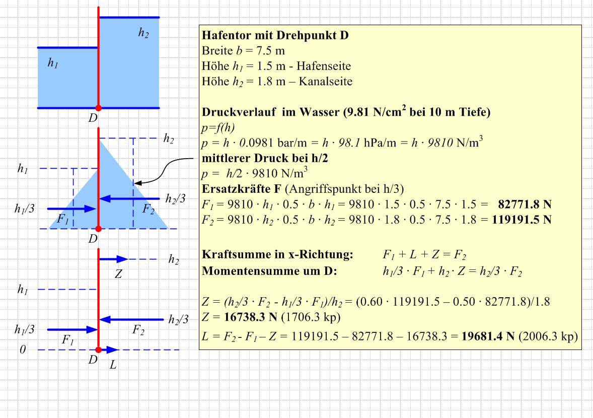 Unter der Annahme, dass der Wasserstand im Kanal einmal 30 cm höher stehen sollte als im Hafenbecken, werden in der folgenden Rechnung die auf das Hafentor wirkenden Kräfte berechnet. Die Rechnung geht von einer Torbreite von 7,5 Metern aus. Weiterhin wird angenommen, dass der Drehpunkt des Tors 1,80 Meter unterhalb der Wasseroberfläche des Kanalniveaus liegt.