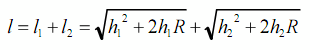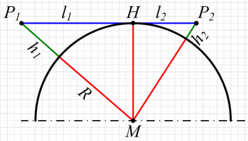 Diese zeigt den kreisförmigen Querschnitt der Erde mit dem Radius R und dem Mittelpunkt M. Wir legen an diesen Kreis eine Tangente durch den Punkt H. Links auf dieser Gerade liegt der Punkt P1 in einer Entfernung l1 von H und einer Höhe h1 oberhalb der Meeresoberfläche. Dieser Punkt P1 sei das Schiff mit einer Höhe h1. Rechts von H liegt der Punkt P2 in einer Entfernung l2 von H und einer Höhe h2. Dieser Punkt P2 sei die Position des Beobachters. Für das Dreieck aus M, P1, H ergibt sich nach dem Satz des Pythagoras die folgende Beziehung: